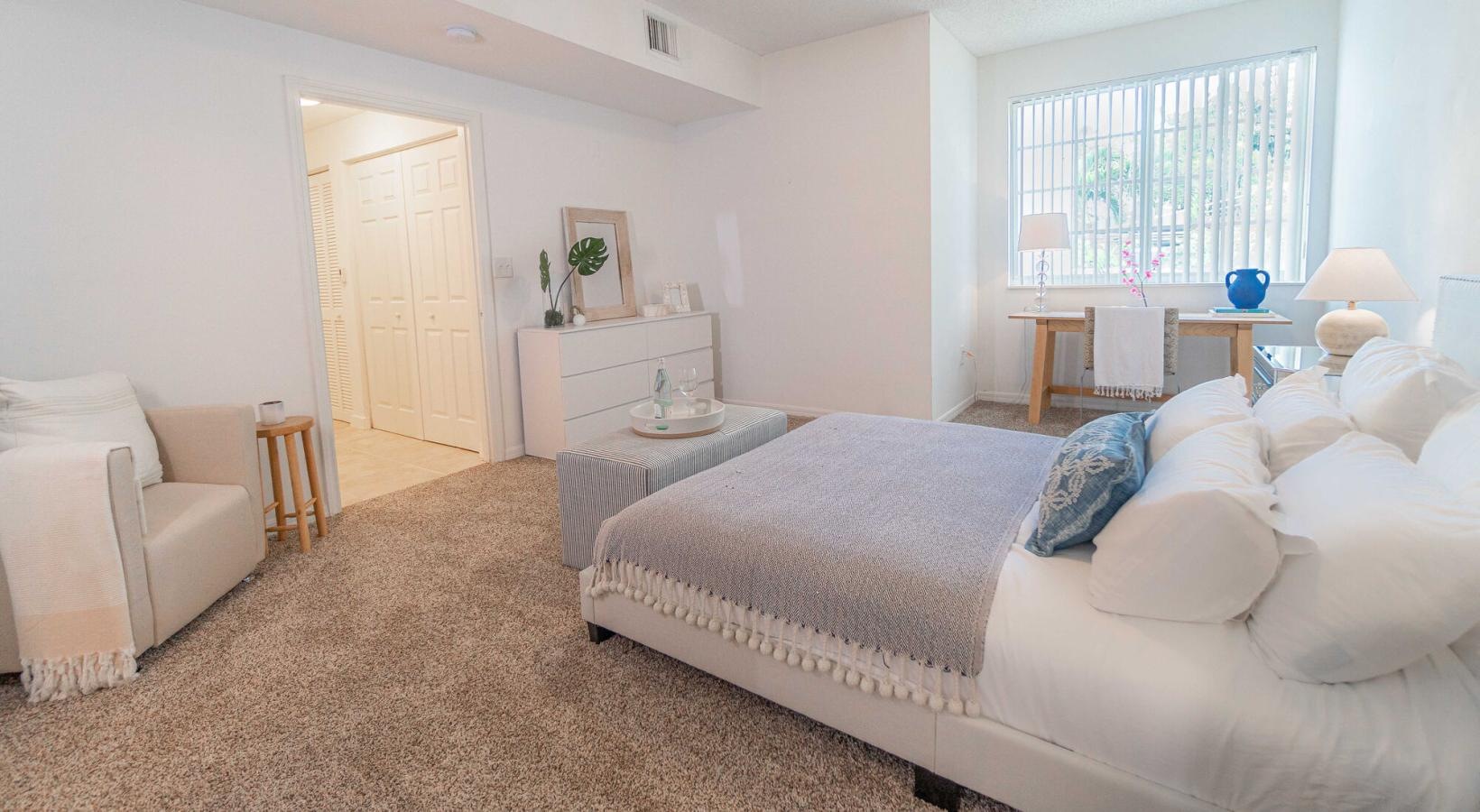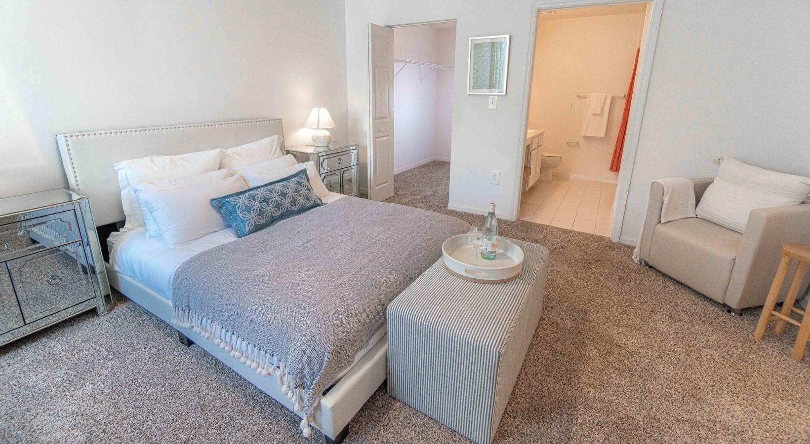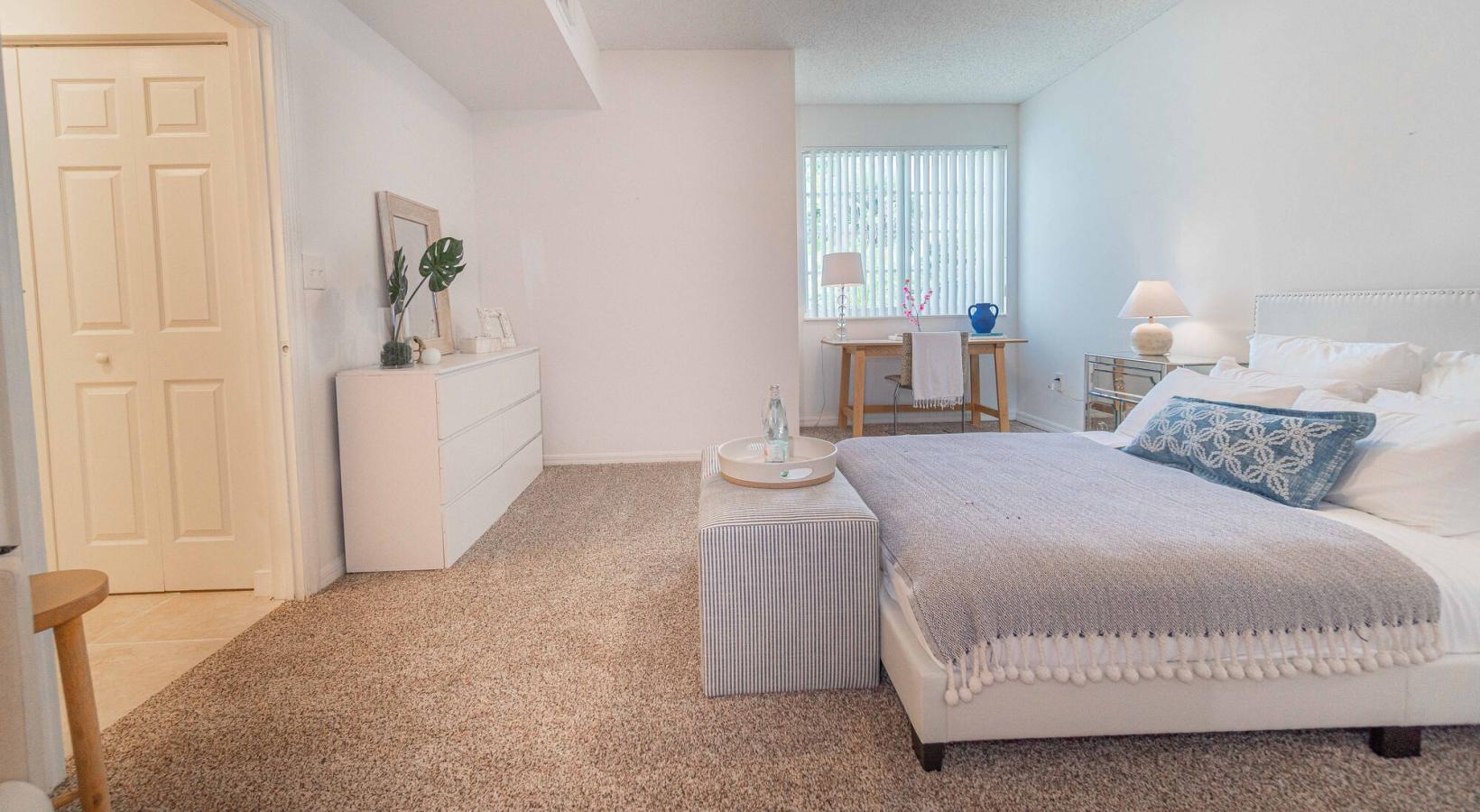 • a bedroom with a bed and a table