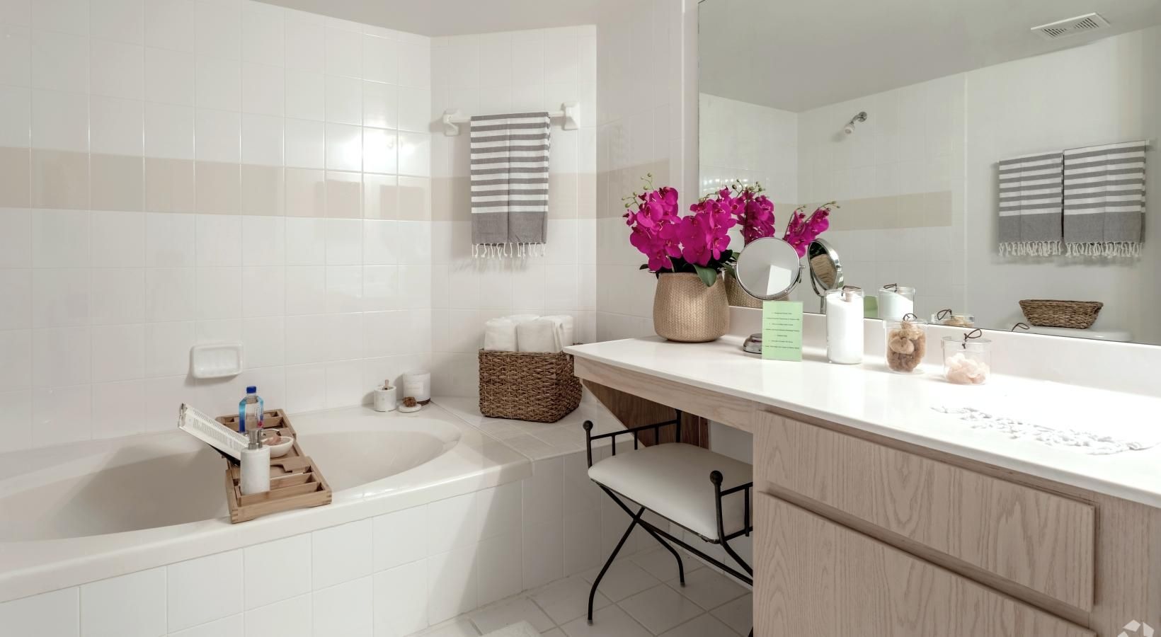 • a bathroom with a tub sink and a mirror