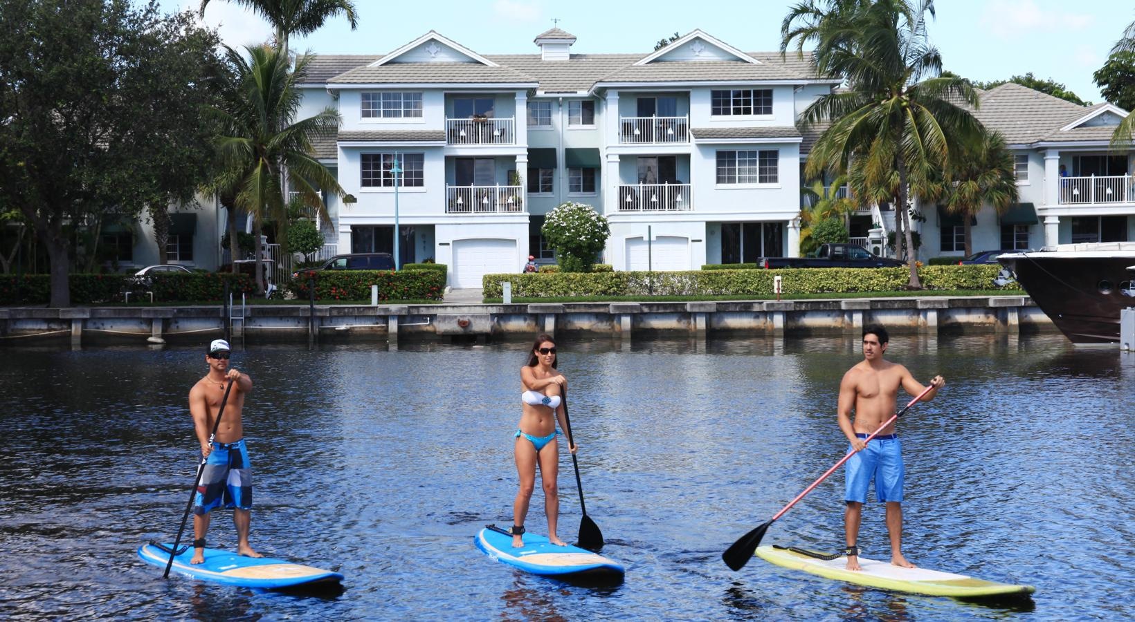 • a group of people paddle surfing