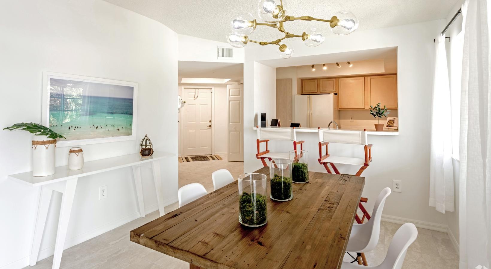 • a dining room with a chandelier and a table