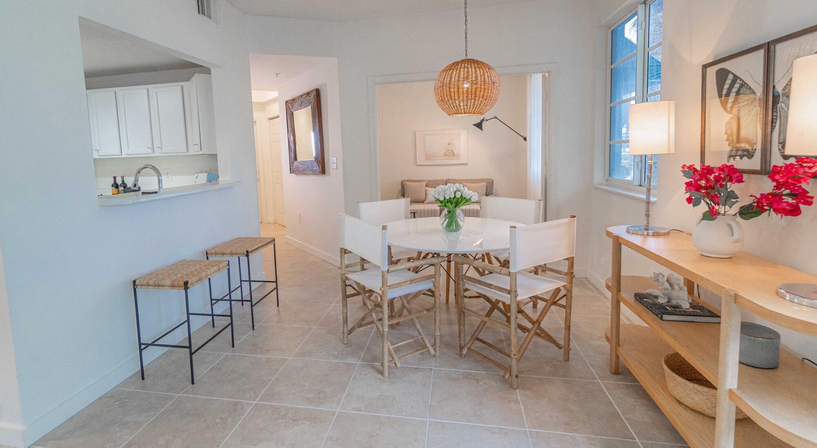 • a dining room with a tile floor